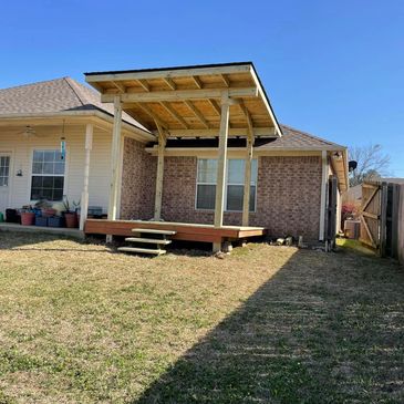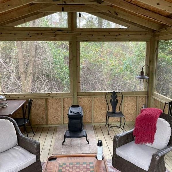 This outdoor living room was custom built to our customers specifications. The large screened in living room is equiped with lighting, ceiling fan, and a wood burning stove making it great for every season.